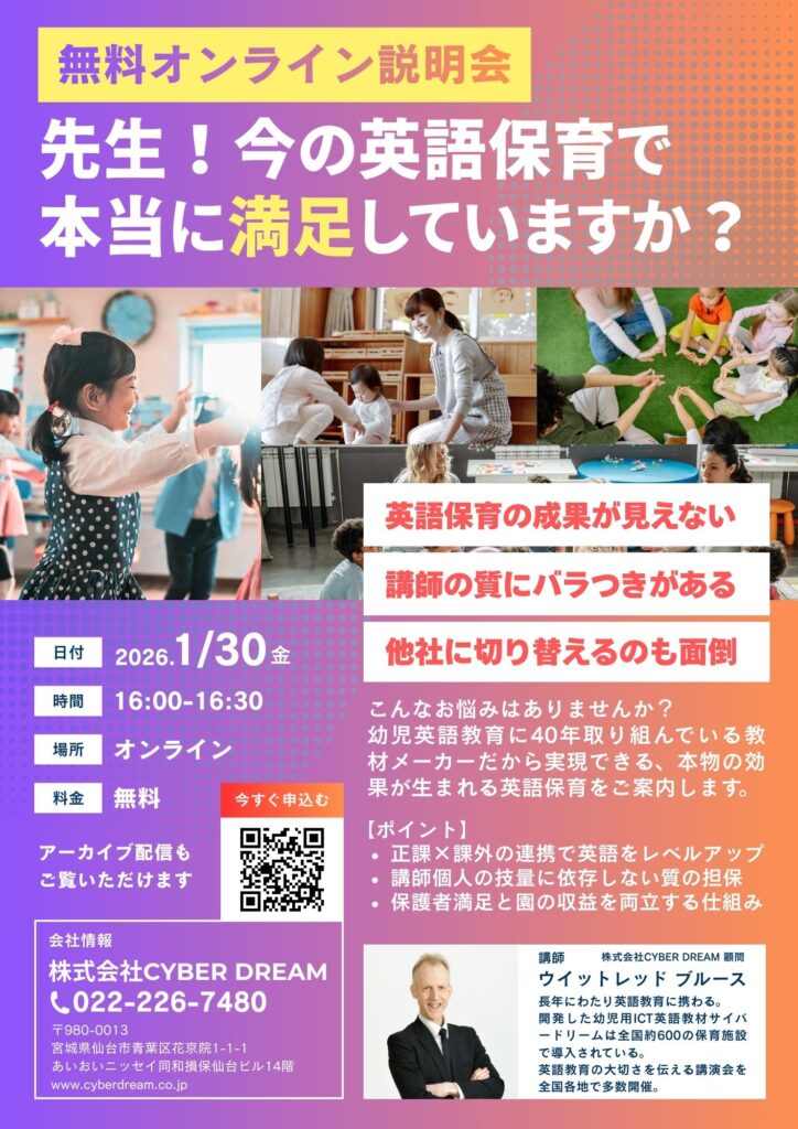 現状の英語保育に少しでも「もどかしさ」を感じていらっしゃる先生に、ぜひこの機会をご活用いただければと思います。