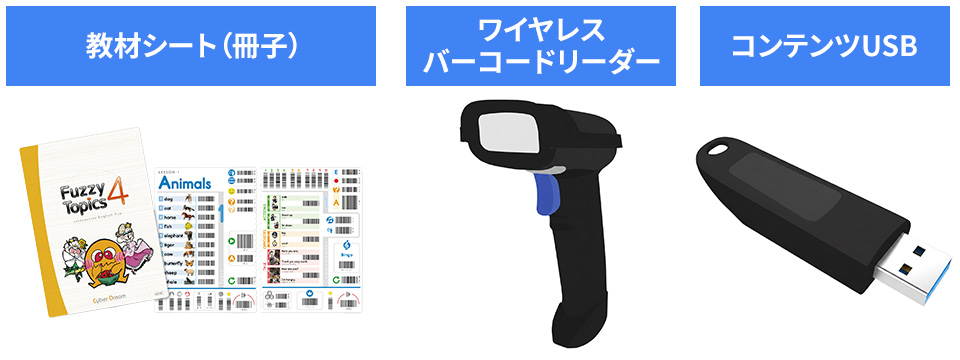 教材シート、ワイヤレスバーコードリーダー、コンテンツUSBが含まれており、英語あそびをすぐに始められる環境が整っています。